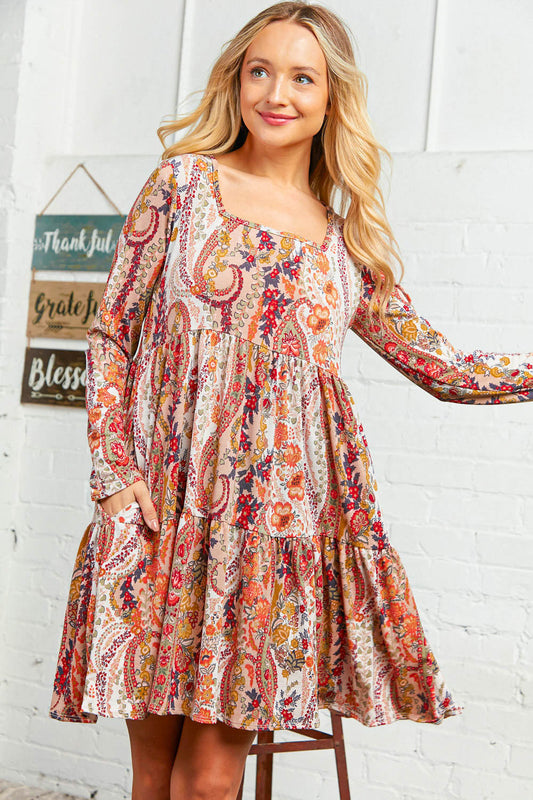 Paisley Floral Print Square Neck Ruffle Dress with Pockets