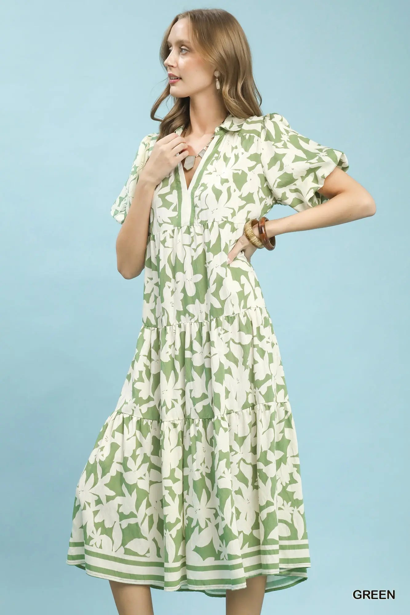 Green Botanical Print A-Line Tiered Dress